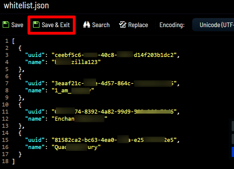 Example Syntax/Format for the WHITELIST.json (You can get uuid's from here http://mcuuid.net/)
